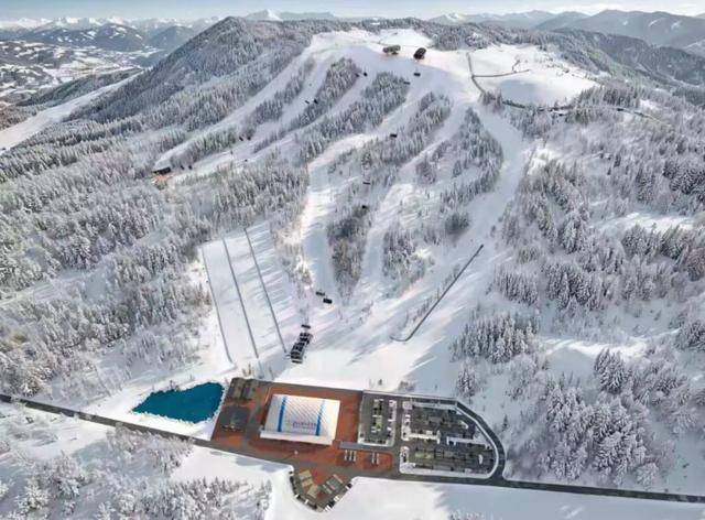 配套设施方面,建设3250平方米气模游客中心、设备用房、生态停车场、蓄水池等,同时配备魔毯4条、4人吊椅索道2条及专业造雪系统,全方位保障游客体验。