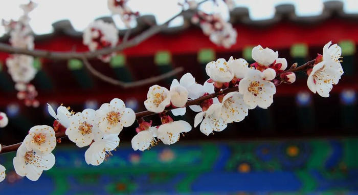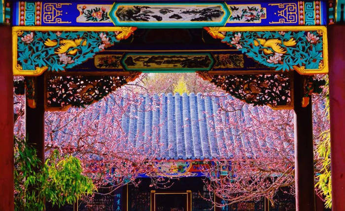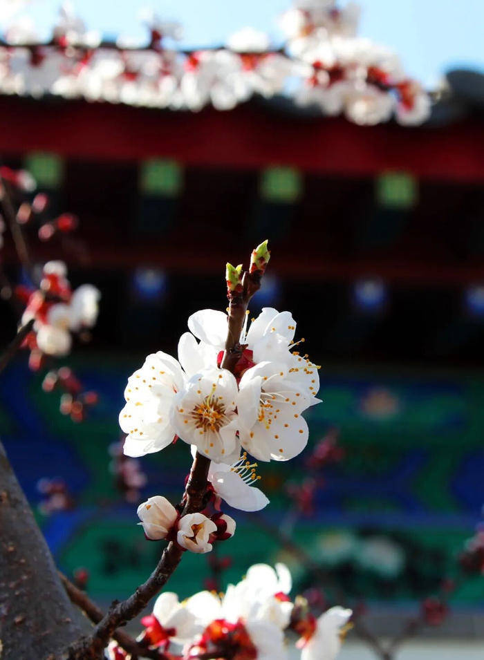 粉白的杏花点缀在圣境的亭台楼阁间,将人文景观与自然美景完美融合,是赏杏、感受传统文化的绝佳之地。