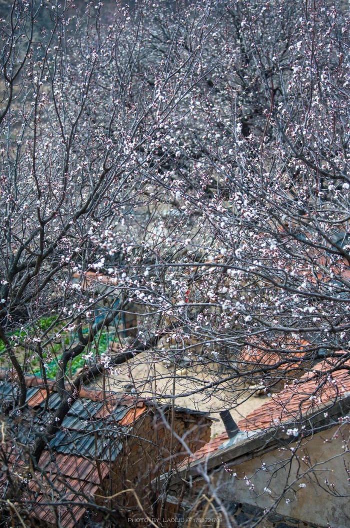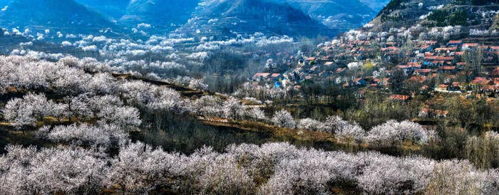 春日的博山九龙峪景区的杏花素雅清新,白里透粉,微风拂过,落英纷飞,诗意满山野。