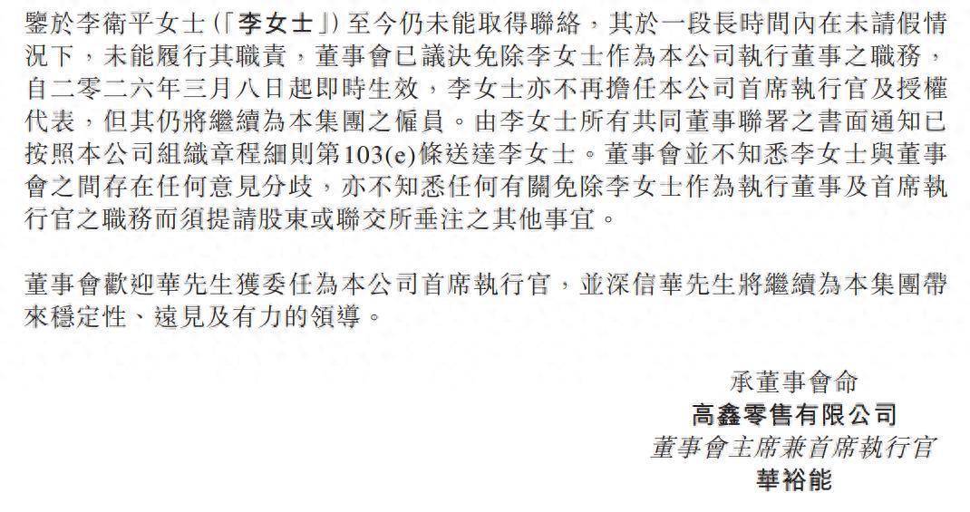 3月8日,大润发母公司高鑫零售(06808)公告称,鉴于李卫平女士至今仍未能取得联络,其于一段长时间内在未请假情况下,未能履行其职责,董事会已议决免除李女士作为本公司执行董事之职务,自3月8日起即时生效。董事会主席华裕能已获委任为本公司首席执行官、由非执行董事调任为执行董事,并获委任为本公司之授权代表,自3月8日起生效。