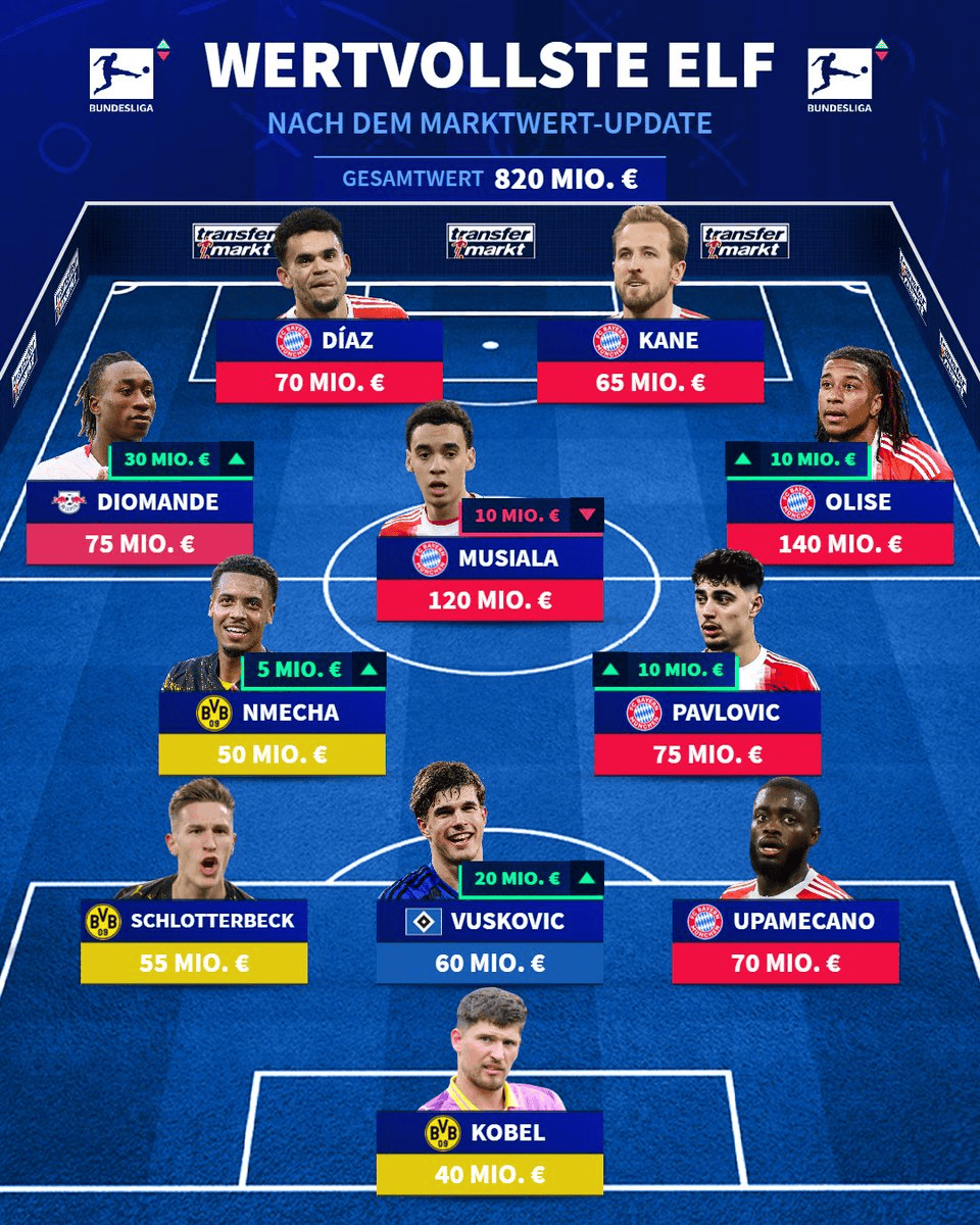 科贝尔(多特蒙德、4000万)、乌帕梅卡诺(拜仁慕尼黑、7000万)、武什科维奇(汉堡、6000万)、施洛特贝克(多特蒙德、5500万)、帕夫洛维奇(拜仁慕尼黑、7500万)、恩梅查(多特蒙德、5000万)、奥利塞(拜仁慕尼黑、1.4亿)、穆西亚拉(拜仁慕尼黑、1.2亿)、迪奥曼德(莱比锡、7500万)、凯恩(拜仁慕尼黑、6500万)、迪亚斯(拜仁慕尼黑、7000万)配资开户网