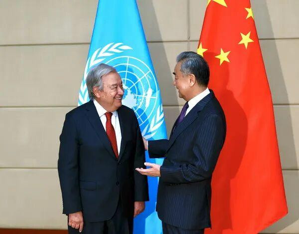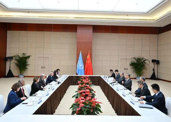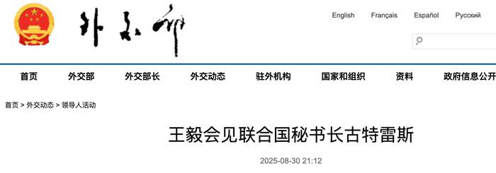 2025年8月30日,中共中央政治局委员、外交部长王毅在天津会见来华出席2025年上海合作组织峰会的联合国秘书长古特雷斯。